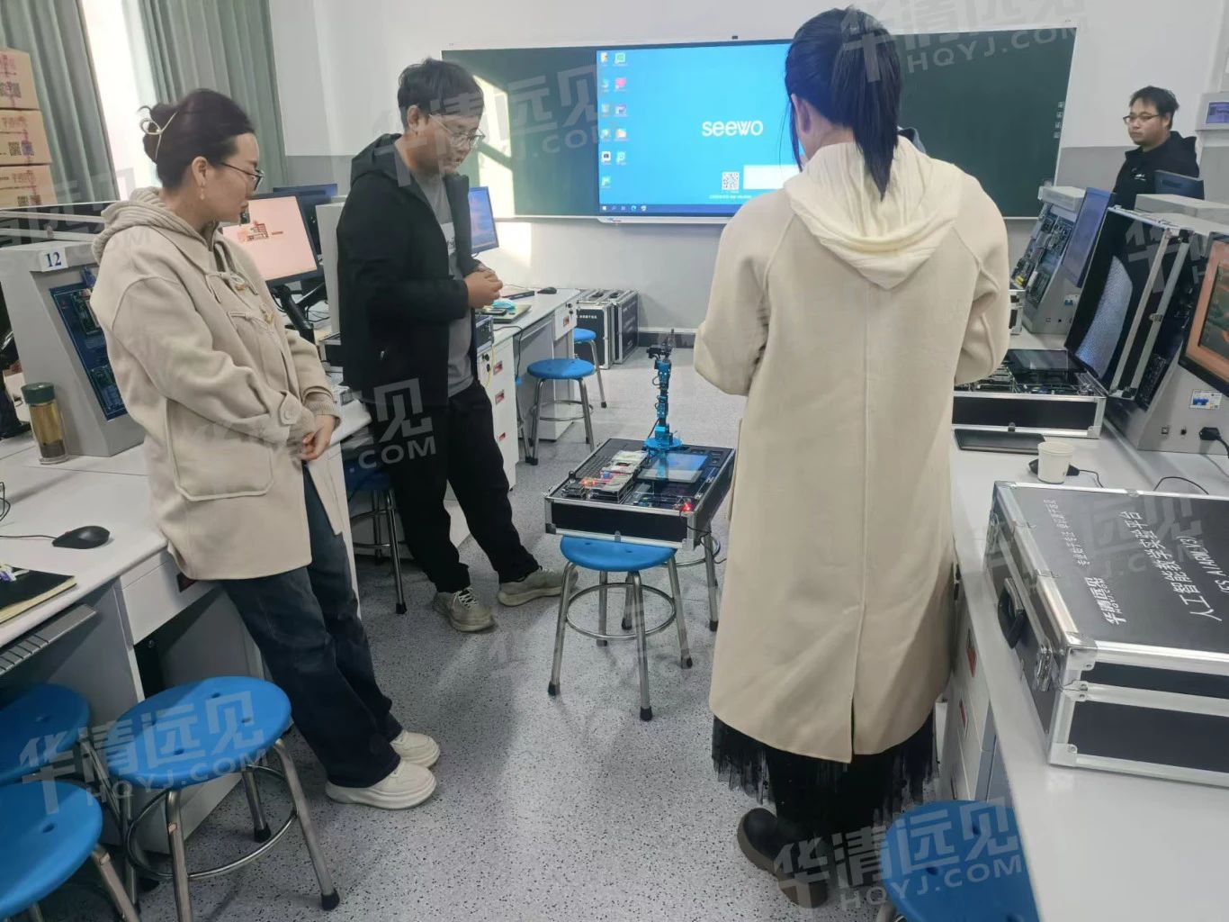华清远见研发工程师对人工智能教学实验平台及人工智能机器人开发套件的使用及实验操作进行相关培训。