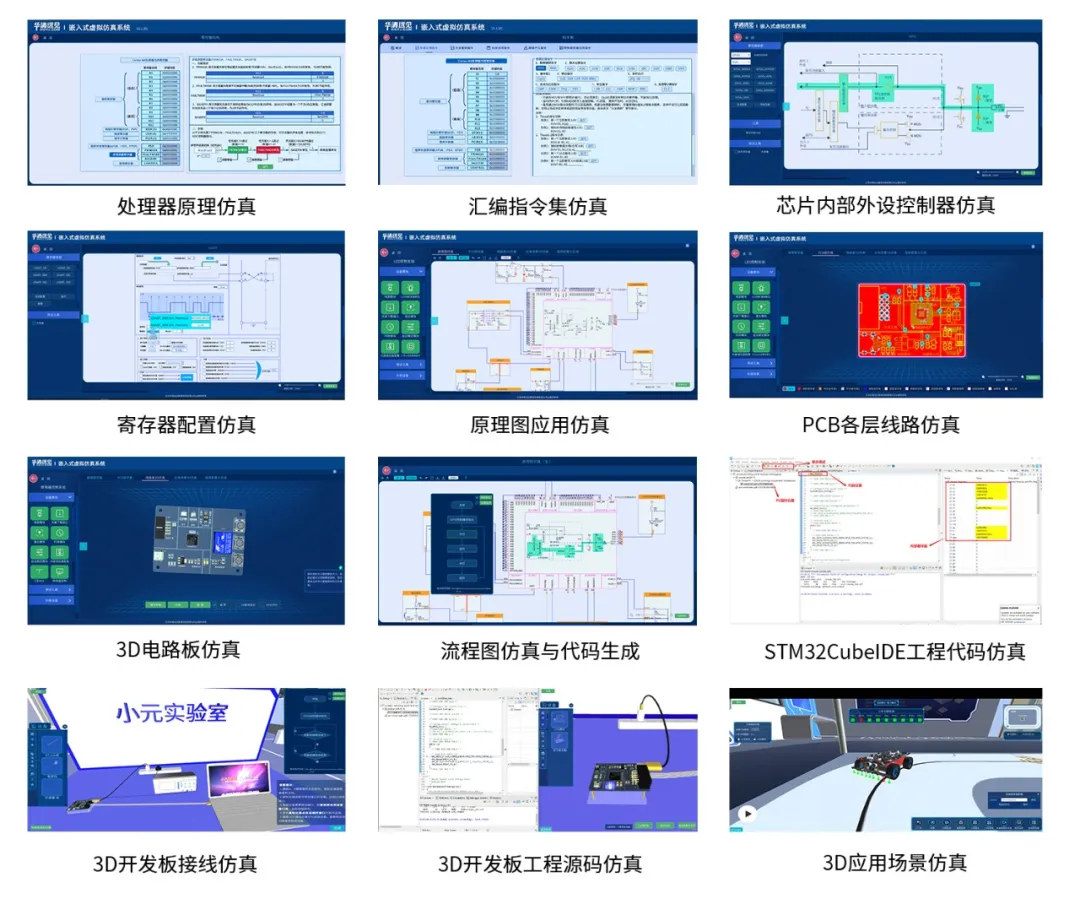 嵌入式虚拟仿真实验平台是以2D实验、3D软件仿真场景为依托,形象展示嵌入式电路板结构及控制器运行运辑并拓展了组件化编程、单片机代码生成等功能,可以在软件平台上实现嵌入式外设控制器理论教学、外设接口应用教学工程源码仿真教学、硬件原理图教学、PCB电路板3D仿真教学。有效解决嵌入式教学中芯片内部结构抽象、无法离开硬件进行教学、系统性教学难等诸多问题,可以在嵌入式教学的实践阶段作为传统硬件嵌入式实验系统的有效补充。