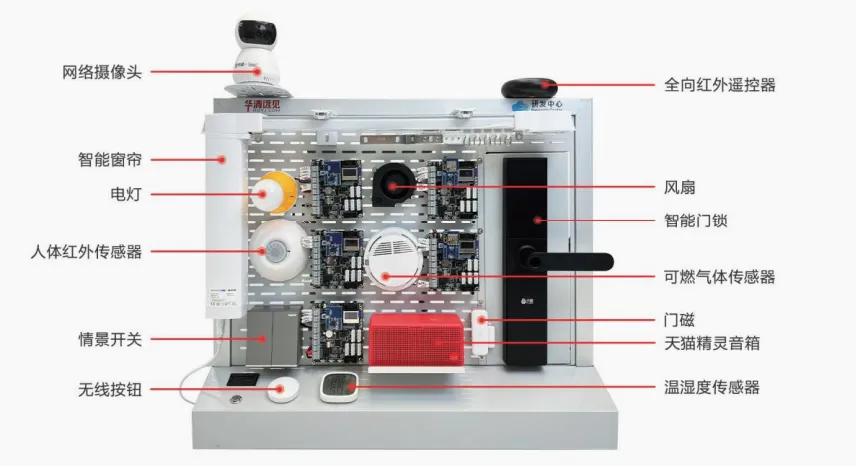 4.AI智能家居实训套件:集成天猫精灵语音控制、RFID 门禁、温湿度传感器,可实现 “语音指令 - 设备响应 - 云端数据同步” 全流程实训。