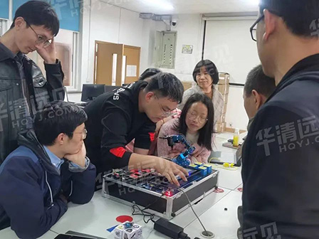 华清远见研发工程师对人工智能教学实验平台及人工智能机器人开发套件的使用及实验操作进行相关培训。