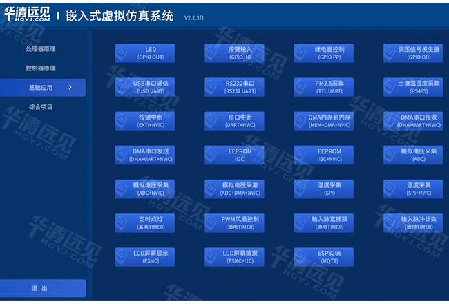 在实验项目管理界面,可以查看处理器原理、控制器原理、基础应用、综合项目四部分实验,按顺序路线图由浅到深再到综合项目,让教学更简单。