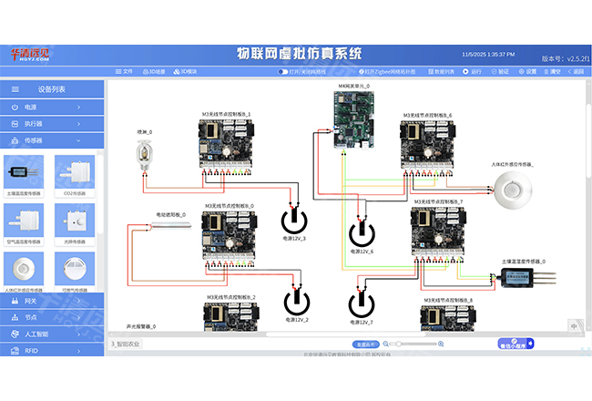 遵循“配置驱动场景”原则,要求2D场景中完成包含传感器、网关、节点的完整设备组态,方能开启3D场景,确保虚拟实验的严谨性与系统设计的完整性。