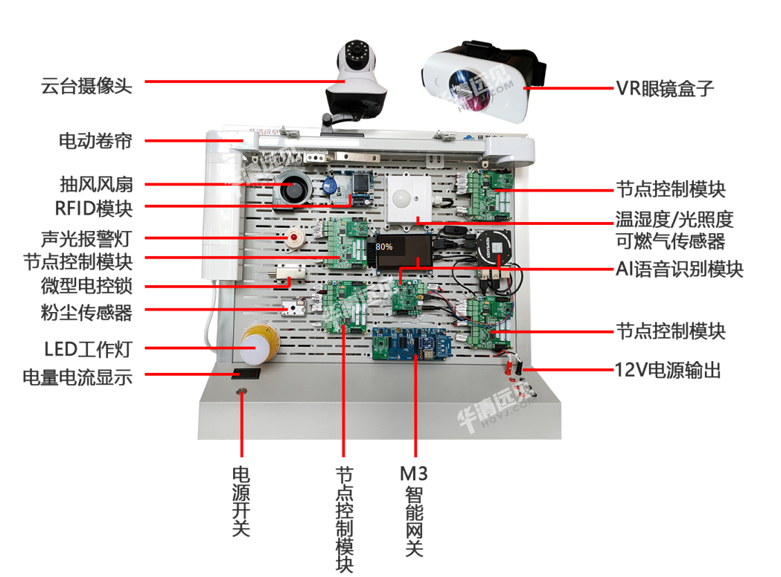 AI+VR物联网智能家居实训套件包含11大功能,全面覆盖了当前智能家居所需功能,主要包含如下: