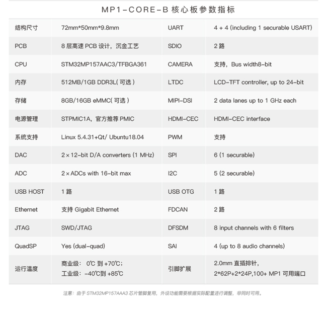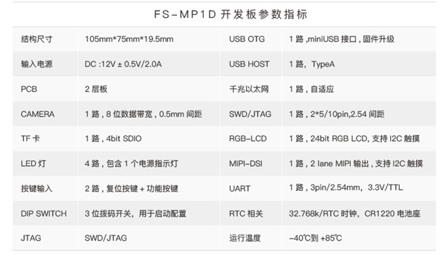 FS-MP1D工控板尺寸为105mm*75mm*19.5mm,硬件接口主要包括千兆以太网、 USB HOST 接口、miniUSB OTG 接口、Micro SD卡槽接口、RGB 接口、MIPI-DSI 接口、DVP 摄像头接口、LED 指示灯、SWD/JTAG 调试端口、UART 调试端口、扩展接口等。FS-MP1D工控板支持5寸MIPI电容屏、7寸RGB 电容屏、300万摄像头、500万摄像头、SWD 仿真器(调试 Cortex-A7/Cortex-M4 内核)等多种配件,能够帮助用户快速实现平台开发与项目验证。