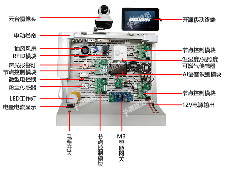 AI智能家居实训套件包含11大功能,全面覆盖了当前智能家居所需功能,主要包含如下: